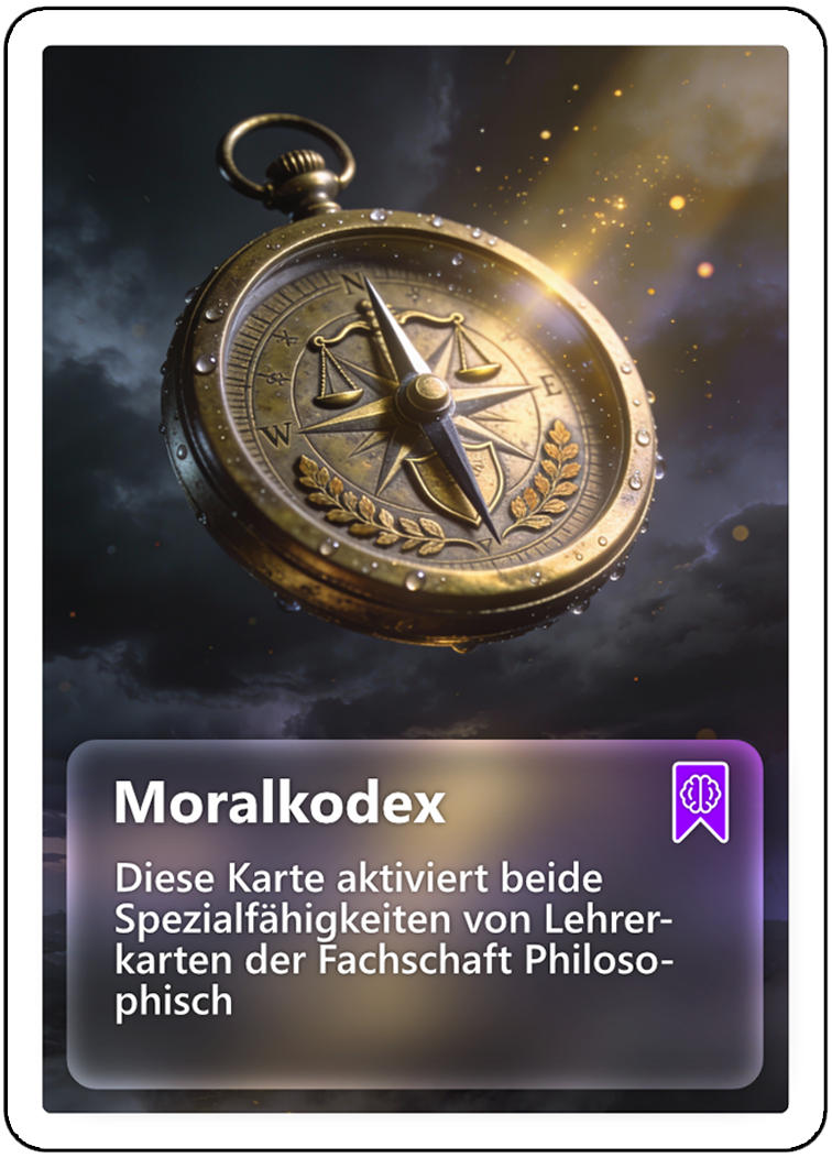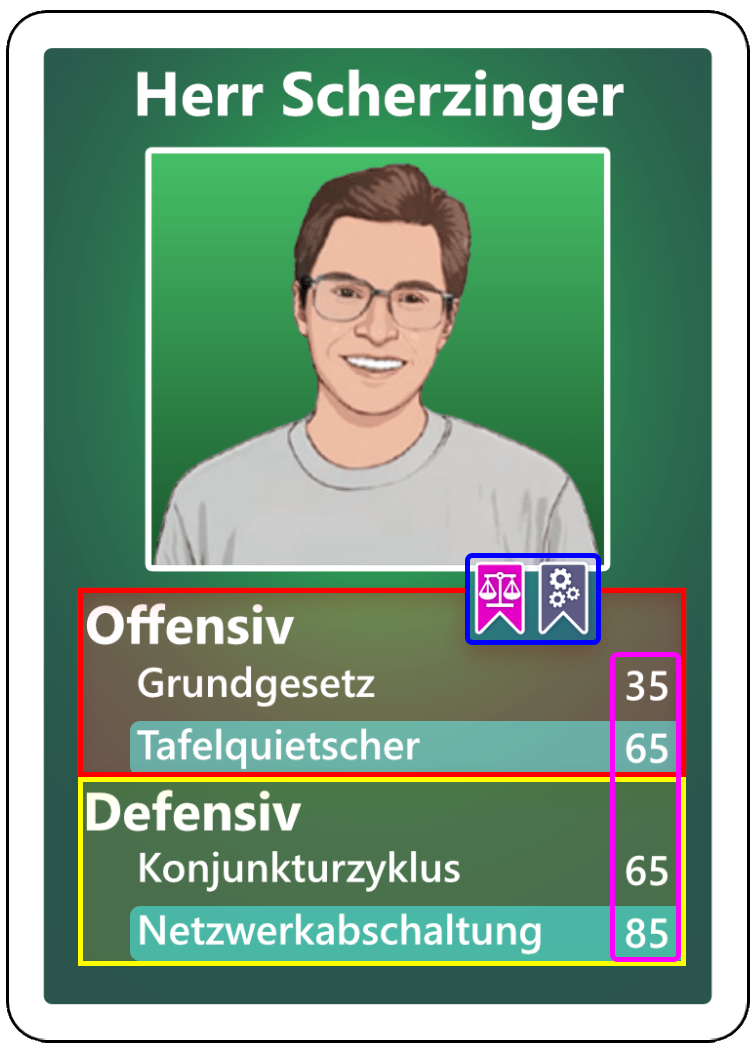 - Unter dem Bild des Lehrers befinden sich ein oder mehrere farbige Symbole. Diese stellen die Fachschaft dar und sind für den Einsatz von Bonuskarten mit Fachschaft-Effekt entscheidend.